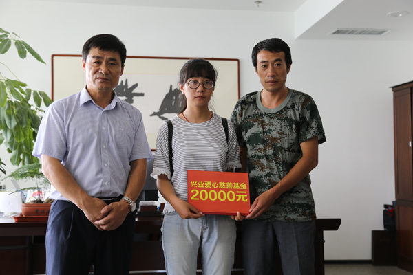 “請(qǐng)把情況寫(xiě)明白,讓她陪著家人去興業(yè)集團(tuán)大廈25樓找辦公室鄭主任領(lǐng)取兩萬(wàn)元救助基金。”這是7月9日晚在“齊魯晚報(bào)今日日照”微信公眾號(hào)的一條留言。 留言人經(jīng)落實(shí)是我集團(tuán)董事長(zhǎng)丁杰。 原來(lái)7月9日,“齊魯晚報(bào)今日日照”微信公眾號(hào)推送了一條消息——《日照龍鳳胎姐姐,高考超本科線54分!欲輟學(xué)打 工幫弟弟治病!幫幫她們!》。文中介紹了一對(duì)龍鳳胎——宋明雪和弟弟宋明峰,如果沒(méi)有意外兩人都今年參加高考,但弟弟在2015年查出胚胎性橫紋肌肉瘤,現(xiàn)在在北京治療,不得已休學(xué)。治療期間已經(jīng)花費(fèi)五十余萬(wàn)元,家庭無(wú)力承擔(dān)。宋明雪在今年高考中考出了537分的好成績(jī),為給弟弟治病,她提出想要放棄上學(xué)打工幫弟弟治病。一家人的遭遇和舉動(dòng)令人動(dòng)容,引來(lái)不少網(wǎng)友留言并捐款。丁杰董事長(zhǎng)也被這個(gè)堅(jiān)強(qiáng)有愛(ài)的家庭所打動(dòng),主動(dòng)提出幫助他們一把。7月12日上午,得知消息的宋明雪和父親宋龍利來(lái)到日照興業(yè)集團(tuán)辦公大樓,來(lái)到丁杰董事長(zhǎng)辦公室表示感謝。 丁杰詢(xún)問(wèn)了宋明雪的學(xué)習(xí)情況,并提出可以在興業(yè)集團(tuán)為她安排暑假實(shí)習(xí)崗位。丁杰握住宋明雪父親宋龍利的手說(shuō):“以后孩子上學(xué)有任何困難,都可以聯(lián)系我們,至少要讓孩子把學(xué)業(yè)完成! 據(jù)了解,目前宋明雪在親戚的介紹下,在青島一家蛋糕店打工,一個(gè)小時(shí)10塊錢(qián),每天工作10小時(shí)。遠(yuǎn)在北京,媽媽正陪著弟弟宋明峰做化療。再做兩期化療,醫(yī)生會(huì)再給弟弟制定下一步的治療方案。父親宋龍利陪著女兒完成高考報(bào)名,過(guò)幾天也要去北京。 在25樓辦公室里,興業(yè)集團(tuán)工會(huì)主席、總裁助理鄭培波與他們簡(jiǎn)單交流。“孩子很堅(jiān)強(qiáng),但是你輟學(xué)也不能解決問(wèn)題,還是要好好上學(xué)才能更有能力幫助家庭!编嵟嗖ü膭(lì)宋明雪。現(xiàn)場(chǎng),為了方便父女倆辦理,興業(yè)集團(tuán)的工作人員向宋明雪詳細(xì)介紹了“興業(yè)愛(ài)心慈善基金”的申請(qǐng)流程,并細(xì)心地列出了需要開(kāi)具的材料清單!斑@是慈善總會(huì)的要求,材料很簡(jiǎn)單,準(zhǔn)備好后發(fā)給我們,大約兩個(gè)周后,2萬(wàn)元善款就將通過(guò)‘興業(yè)愛(ài)心慈善基金’打到你們的銀行賬戶(hù)上去!编嵟嗖ㄑa(bǔ)充說(shuō)。 (文/ 王瑜)