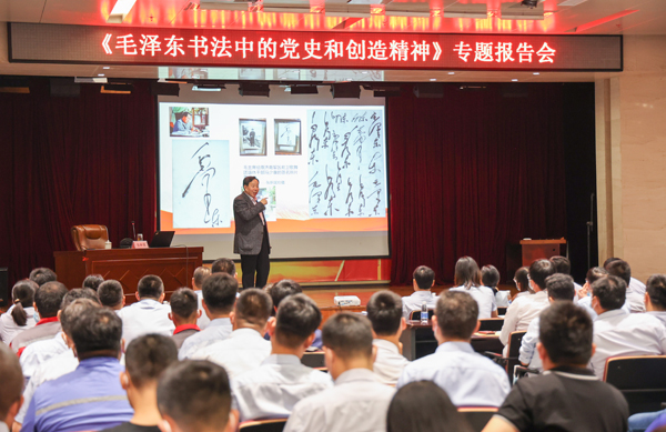 為推進(jìn)黨史學(xué)習(xí)教育走深走實(shí),根據(jù)興業(yè)集團(tuán)黨校年度課程安排,9月30日,在國慶節(jié)來臨之際,集團(tuán)黨校邀請齊魯工業(yè)大學(xué)客座教授、山東省地質(zhì)工會(huì)三級(jí)調(diào)研員張新國作了《毛澤東書法中的黨史和創(chuàng)造精神》的專題報(bào)告,為興業(yè)集團(tuán)黨委近200名黨員代表上了一堂創(chuàng)新、生動(dòng)的黨課。 在三個(gè)小時(shí)的報(bào)告中,張新國以習(xí)近平總書記“七一”重要講話精神為指引,以毛澤東書法中的黨史和創(chuàng)新精神為主題,以毛體書法為主線,用大量鮮活生動(dòng)的歷史事件和詩詞書法作品,為黨員干部深入講述了中國革命各個(gè)時(shí)期毛澤東書法的演變過程,宣講了毛澤東書法和詩詞中蘊(yùn)含的黨的光輝歷史,解析了毛澤東同志的創(chuàng)新思想,引導(dǎo)黨員干部深入學(xué)習(xí)黨的百年歷史,大力弘揚(yáng)中華優(yōu)秀傳統(tǒng)文化。 集團(tuán)黨委副書記、工會(huì)主席鄭培波主持活動(dòng)時(shí)要求,集團(tuán)各級(jí)黨組織和廣大黨員干部群眾要以此次專題報(bào)告會(huì)為契機(jī),牢牢把握學(xué)史明理、學(xué)史增信、學(xué)史崇德、學(xué)史力行的總要求,豐富學(xué)習(xí)內(nèi)容,活化教育載體,把主題教育活動(dòng)與推進(jìn)和服務(wù)各項(xiàng)中心工作結(jié)合起來,與“我為群眾辦實(shí)事”實(shí)踐活動(dòng)結(jié)合起來,切實(shí)把學(xué)習(xí)教育成效轉(zhuǎn)化為推動(dòng)工作的內(nèi)生動(dòng)力,努力推動(dòng)集團(tuán)各項(xiàng)事業(yè)實(shí)現(xiàn)高質(zhì)量發(fā)展。 報(bào)告開始前,張新國實(shí)地參觀了興業(yè)集團(tuán)慶祝建黨100周年職工書畫攝影展、黨群服務(wù)中心和興業(yè)集團(tuán)黨史學(xué)習(xí)教育圖片展,并進(jìn)行了座談交流,對興業(yè)集團(tuán)黨群工作和企業(yè)文化建設(shè)工作給予高度評價(jià)。 據(jù)了解,張新國是齊魯工業(yè)大學(xué)、山東管理學(xué)院干部培訓(xùn)中心客座教授,山東省地質(zhì)工會(huì)三級(jí)調(diào)研員。他潛心研習(xí)毛體書法,于2012年8月被中國文聯(lián)等單位授予全國毛體書法家十佳、全國毛體書法“潤之”金獎(jiǎng)。與此同時(shí),張教授長期以毛體書法為載體,致力于推廣紅色文化,多次為全國總工會(huì)等黨政機(jī)關(guān)和社會(huì)各界培訓(xùn)班做專題講座。(文/張斌)