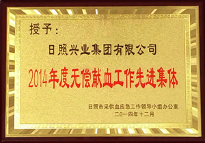 ·2014年12月,授予興業(yè)集團(tuán)2014年底無償獻(xiàn)血工作先進(jìn)集團(tuán)稱號