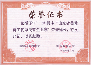 · 2005年12月,丁杰董事長榮獲“山東省關(guān)愛員工優(yōu)秀民營企業(yè)家”榮譽稱號