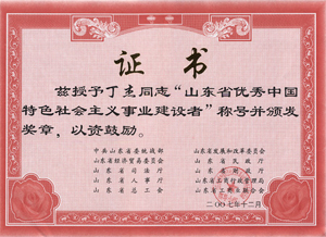 · 2007年12月,丁杰董事長榮獲“山東省優(yōu)秀中國特色社會主義事業(yè)建設(shè)者”榮譽稱號