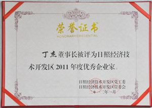 ·2012年1月,丁杰董事長被評為“日照市經(jīng)濟技術(shù)開發(fā)區(qū)優(yōu)秀企業(yè)家”榮譽稱號