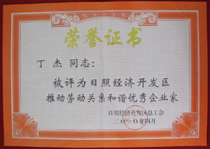 · 2010年4月,丁杰董事長榮獲“日照經(jīng)濟開發(fā)區(qū)推動勞動關(guān)系和諧優(yōu)秀企業(yè)家”榮譽稱號