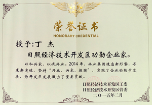 ·2015年2月,日照經(jīng)濟技術(shù)開發(fā)區(qū)授予丁杰董事長“日照經(jīng)濟技術(shù)開發(fā)區(qū)功勛企業(yè)家”稱號。