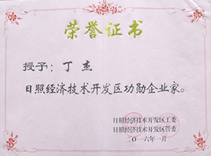 ·2016年1月,日照經(jīng)濟技術(shù)開發(fā)區(qū)授予丁杰董事長“日照經(jīng)濟技術(shù)開發(fā)區(qū)功勛企業(yè)家”稱號。