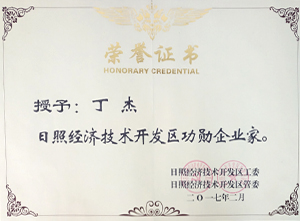 ·2017年2月,日照經(jīng)濟技術(shù)開發(fā)區(qū)授予丁杰董事長“日照經(jīng)濟技術(shù)開發(fā)區(qū)功勛企業(yè)家”稱號。