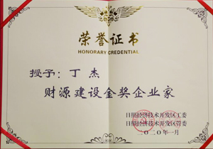 ·2020年1月,日照經(jīng)濟技術(shù)開發(fā)區(qū)授予丁杰“財源建設(shè)金獎企業(yè)家”
